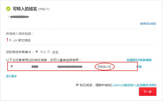 5、登錄阿里云/萬網(wǎng)【管理控制臺】- 【域名】- 進入【域名轉入】- 填寫需轉入域名(包括后綴)和域名轉入密碼,域名轉入需符合規(guī)則 - 選擇一個【已實名認證】的信息模板,點擊【下一步】,提交訂單、立即結算 - 按照流程指引完成即可。如下圖所示: