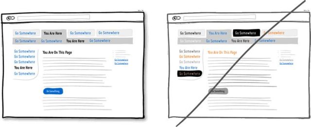 應(yīng)用視覺元素之手法可以幫助使用者了解頁面上的功能與結(jié)構(gòu),例如顏色、深度與對比度等。同時(shí)為了與你的使用者精準(zhǔn)的溝通,需點(diǎn)擊的行為(如連結(jié)或按鈕)與需選擇的元件(如選單)設(shè)計(jì)上要有所區(qū)別,同時(shí)上方的文字必須描述清楚,才有利使用者辨別。在底下的例子中,作者選擇了藍(lán)色做為網(wǎng)站上使用者可點(diǎn)擊元件的主色,而黑色為標(biāo)示已選擇的項(xiàng)目或是現(xiàn)在頁面的名稱,簡單明顯的顏色應(yīng)用,讓使用者藉由顏色的線索更輕易的學(xué)習(xí)和使用網(wǎng)站功能。最后請記得,千萬別使用難以辨識(shí)或過多的顏色混淆使用者。