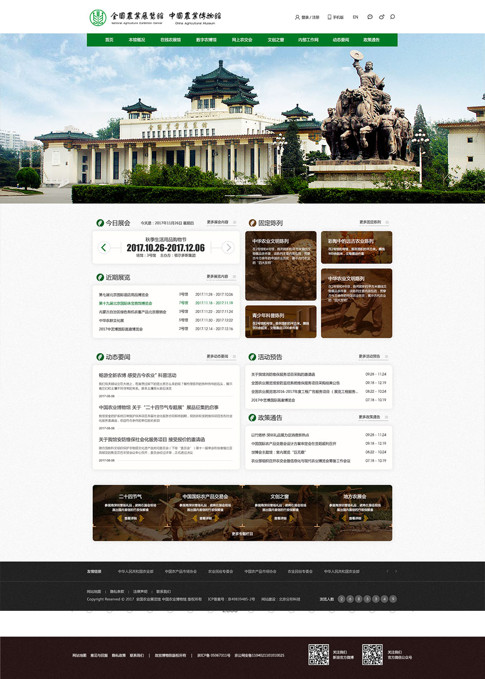 全國農(nóng)業(yè)展覽館(中國農(nóng)業(yè)博物館)擔(dān)負(fù)著宣傳黨和國家“三農(nóng)”政策、展示現(xiàn)代農(nóng)業(yè)發(fā)展成果、促進(jìn)農(nóng)產(chǎn)品流通促銷、普及農(nóng)業(yè)知識(shí)、保護(hù)、傳承和弘揚(yáng)中華農(nóng)業(yè)文明等方面的工作職責(zé)。全國農(nóng)業(yè)展覽館(中國農(nóng)業(yè)博物館)占地面積43公頃,其室內(nèi)可用于展覽的面積21000平方米,室外展場(chǎng)面積約40000平方米。中國農(nóng)業(yè)博物館室內(nèi)陳列面積為6600平方米,包含《中華農(nóng)業(yè)文明陳列》等六個(gè)室內(nèi)基本陳列;室外展園古代傳統(tǒng)農(nóng)事園、現(xiàn)代科學(xué)農(nóng)事園兩部分組成,面積約10000余平方米。先后獲得國家愛國主義教育基地、全國青少年科技教育基地、北京市科普教育基地、國際科學(xué)與和平教育基地等榮譽(yù)稱號(hào)。