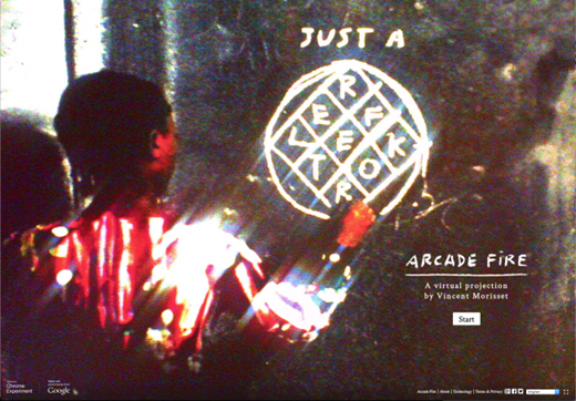 Arcade Fire推出了“互動電影”來推廣他們的專輯?!禦eflektor》作為同名單曲的MV推出。使用電腦上的瀏覽器時,會跳出一個提示“連接你的智能手機或者平板”。電腦攝像頭會在你搖動設(shè)備時識別出來,并實時“映射”到視頻中。
